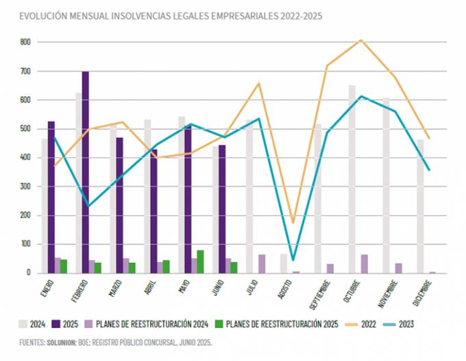 El informe de insolvencias empresariales elaborado por Solunion muestra un descenso del 1,5% en el acumulado en el primer semestre del año, a pesar del repunte del 0,9% registrado en junio. Todo ello tras cerrar el primer trimestre con un incremento acumulado del 5,2%, por lo que ahora se observa una moderación y Solunion prevé que la tendencia a la estabilización se mantenga lo que queda de año.