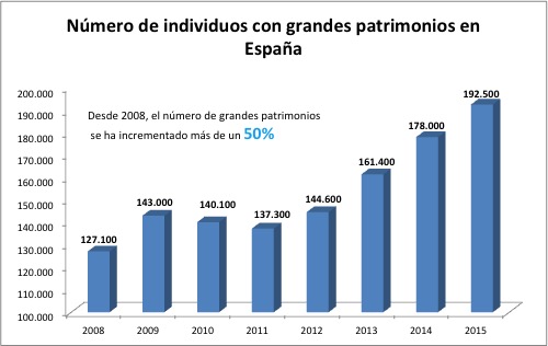 Según el ‘Informe Mundial de la Riqueza 2016’ elaborado por Capgemini, el número de millonarios en España aumentó en 15.000 personas en 2015 y desde 2008 se ha incrementado un 50%, alcanzando las casi 193.000 personas.