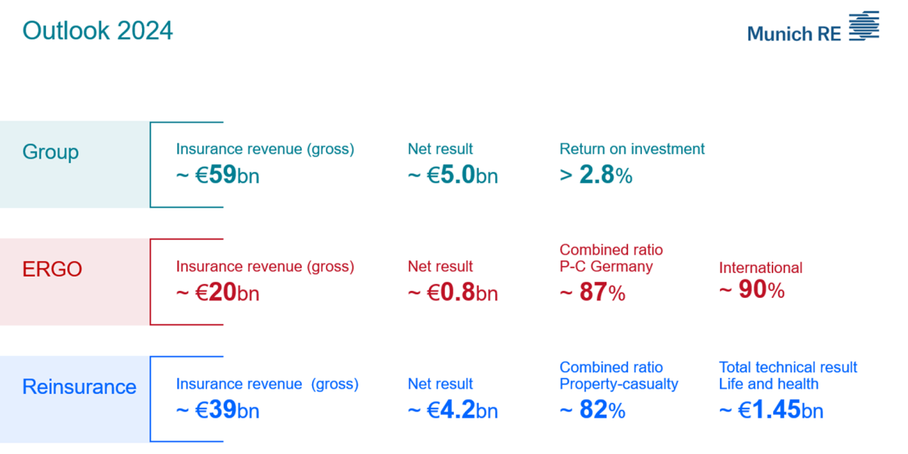 En el ámbito del reaseguro, Munich Re prevé un aumento de los ingresos hasta 39.000 millones de euros y un beneficio neto de 4.200 millones de euros en 2024. Munich Re cree que se seguirá beneficiando de un entorno de mercado favorable, donde aprovechará su sólida posición para impulsar un crecimiento rentable. También espera que ERGO genere unos ingresos por seguros de 20.000 millones de euros en 2024 y contribuya al beneficio con 800 millones de euros.