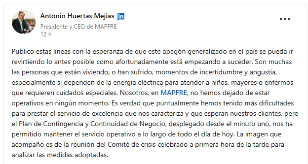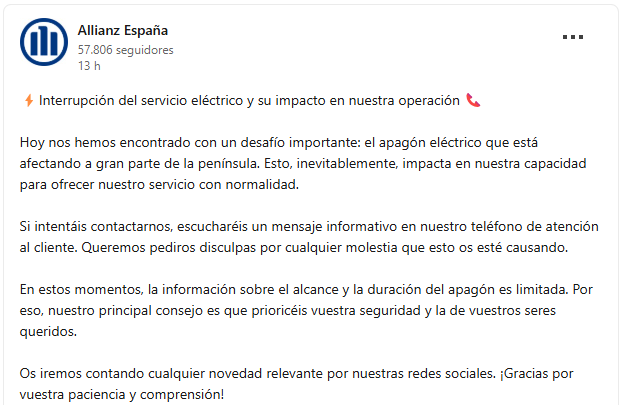 Ayer, las aseguradoras estaban como todos, casi inoperativas. Allianz publicaba este mensaje en LinkedIn: "Hoy nos hemos encontrado con un desafío importante: el apagón eléctrico que está afectando a gran parte de la península. Esto, inevitablemente, impacta en nuestra capacidad para ofrecer nuestro servicio con normalidad. Si intentáis contactarnos, escucharéis un mensaje informativo en nuestro teléfono de atención al cliente. Queremos pediros disculpas por cualquier molestia que esto os esté causando. En estos momentos, la información sobre el alcance y la duración del apagón es limitada. Por eso, nuestro principal consejo es que prioricéis vuestra seguridad y la de vuestros seres queridos. Os iremos contando cualquier novedad relevante por nuestras redes sociales. ¡G