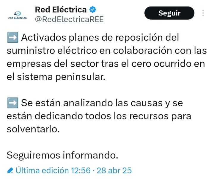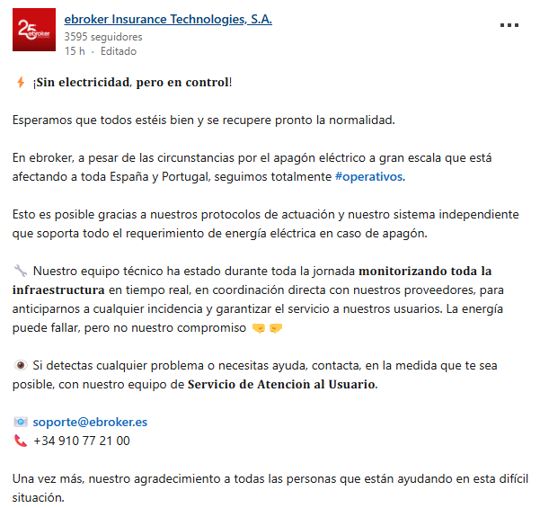 Y ebroker también estuvo operativa, como apuntó en LinkedIn: "¡Sin electricidad, pero en control! Esperamos que todos estéis bien y se recupere pronto la normalidad. En ebroker, a pesar de las circunstancias por el apagón eléctrico a gran escala que está afectando a toda España y Portugal, seguimos totalmente #operativos. Esto es posible gracias a nuestros protocolos de actuación y nuestro sistema independiente que soporta todo el requerimiento de energía eléctrica en caso de apagón. Nuestro equipo técnico ha estado durante toda la jornada monitorizando toda la infraestructura en tiempo real, en coordinación directa con nuestros proveedores, para anticiparnos a cualquier incidencia y garantizar el servicio a nuestros usuarios. La energía puede fallar, pero no nuestro compromiso".