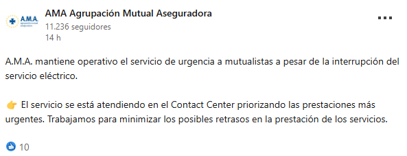 Y A.M.A. tranquilizaba también en LinkedIn a sus mutualistas: "A.M.A. mantiene operativo el servicio de urgencia a mutualistas a pesar de la interrupción del servicio eléctrico. El servicio se está atendiendo en el Contact Center priorizando las prestaciones más urgentes. Trabajamos para minimizar los posibles retrasos en la prestación de los servicios".