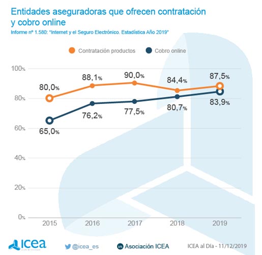 El cobro on-line sigue aumentando en el seguro español. Los datos de ICEA señalan que este año ha alcanzando el 83,9%, frente al 80,7% de hace un año. Si la comparación la llevamos a 2015, el avance del sector se ha incrementado en casi un 20% puesto que en aquél año únicamente el 65% de las empresas ofrecían esta opción.