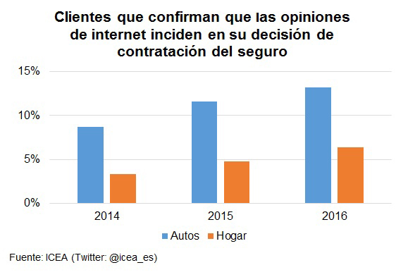 Según ICEA, las opiniones publicadas por otros consumidores en foros, blogs o redes sociales tienen cada vez mayor incidencia en la decisión de contratación de un seguro, de forma más evidente en el caso de las pólizas de Autos, pero con un aumento más significativo en Hogar, multiplicando por 2 el porcentaje de 2014.