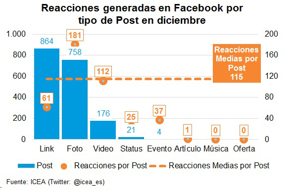 En diciembre, las páginas de Facebook en español del sector asegurador generaron 1.824 nuevos post que originaron 210.041 nuevas reacciones (Me Gusta, Comentarios o Compartir) dentro de la comunidad, según ICEA. Los links y las fotos son el formato más utilizado por las compañías para realizar sus publicaciones, siendo estas últimas, junto con los videos y los links, las que generan mayores reacciones entre los usuarios por cada publicación.