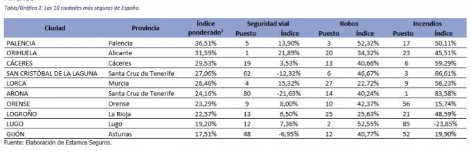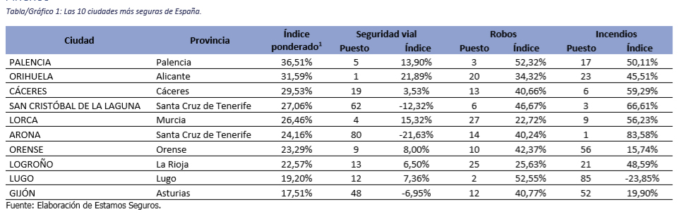 Unespa ha elaborado un ranking para averiguar cuál es la ciudad española de más de 75.000 habitantes más segura. Para ello ha analizado 3 tipos de percances asegurables como son los accidentes de tráfico, los robos en hogares y comercios y los incendios. De este análisis y ponderando los datos otorgando más peso a los dos primeros y un 20% al tercero la localidad más segura es Palencia con un 37% más de seguridad que el conjunto del país, seguida de la alicantina Orihuela (32%) y Cáceres (29,5%).