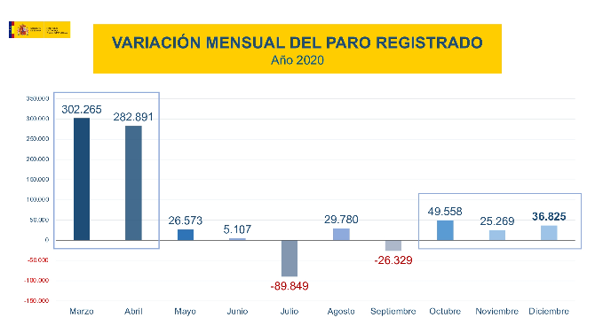 Y, obviamente, esta reducción en la afiliación se refleja en el aumento del paro. Según datos facilitados por el Ministerio de Trabajo y Economía Social, el año 2020 finalizó con 3.888.137 personas inscritas en el SEPE en situación de desempleo, después de incrementarse un 0,96% el paro en diciembre, algo inusual debido a las campañas de navidad.