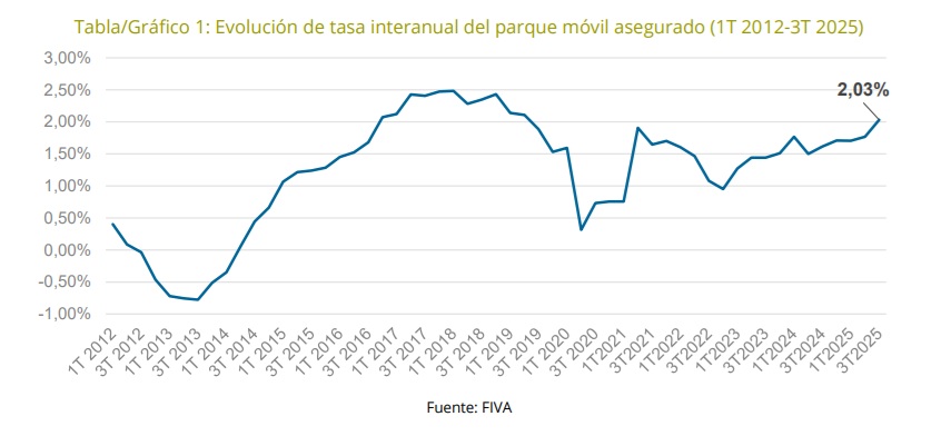 En los últimos 14 trimestres, el parque de vehículos asegurados se ha ido incrementando poco a poco. Los últimos datos del FIVA, publicados por Unespa, indican que ya se han alcanzado las 34.584.416 unidades lo que supone un incremento del 2,03%, el mayor desde 2019, durante el tercer trimestre de 2025. En comparación con el mismo periodo del año anterior, esta evolución supuso un aumento absoluto de 689.060 unidades.