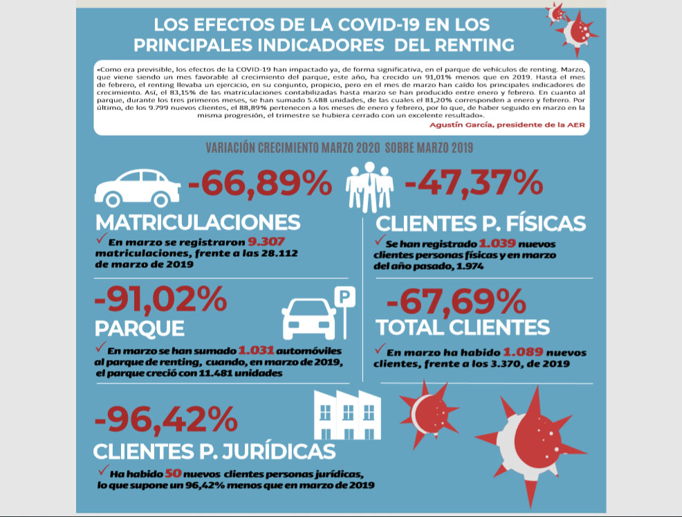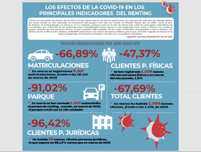 Agustín García, presidente de la AER señala que "como era previsible, los efectos de la Covid-19 han impactado ya, de forma significativa, en el parque de vehículos de renting. Marzo, que viene siendo un mes favorable al crecimiento del parque, este año, ha crecido un 91,01% menos que en 2019. Hasta el mes de febrero, el renting llevaba un ejercicio, en su conjunto, propicio, pero en el mes de marzo han caído los principales indicadores de crecimiento. Así, el 83,15% de las matriculaciones contabilizadas hasta marzo se han producido entre enero y febrero. En cuanto al parque, durante los tres primeros meses, se han sumado 5.488 unidades, de las cuales el 81,20% corresponden a enero y febrero. Por último, de los 9.799 nuevos clientes, el 88,89% pertenecen a los meses de enero y febrero, por lo que, de haber seguido en marzo en la misma progresión, el trimestre se hubiera cerrado con un excelente resultado. En la situación que nos encontramos es muy difícil predecir cómo evolucionarán los indicadores reflejados del renting, porque ahora todos los esfuerzos están centrados en terminar con la urgencia sanitaria. En este sentido, hay que destacar que las compañías de renting están volcadas, cada una en la medida de sus posibilidades, en paliar los efectos de la crisis, colaborando con sus clientes, proveedores y comprometiéndose con las necesidades sociales y sanitarias de esta circunstancia. También es importante centrarse y prepararse para el "día después", porque será muy importante la colaboración de todos para normalizar la situación, tanto social como económicamente. A este respecto, el papel del renting será crucial, porque contribuirá a dinamizar la movilidad, al permitir a los consumidores el uso de un vehículo sin tener que asumir riesgo de depreciación ni hacer grandes desembolsos de dinero. El renting, que antes de esta crisis ya había conseguido popularizarse en España, tiene un gran recorrido en nuestro país, pero será fundamental que se establezcan los mecanismos necesarios para reactivar la economía e impulsar la productividad, para que nadie se quede atrás".