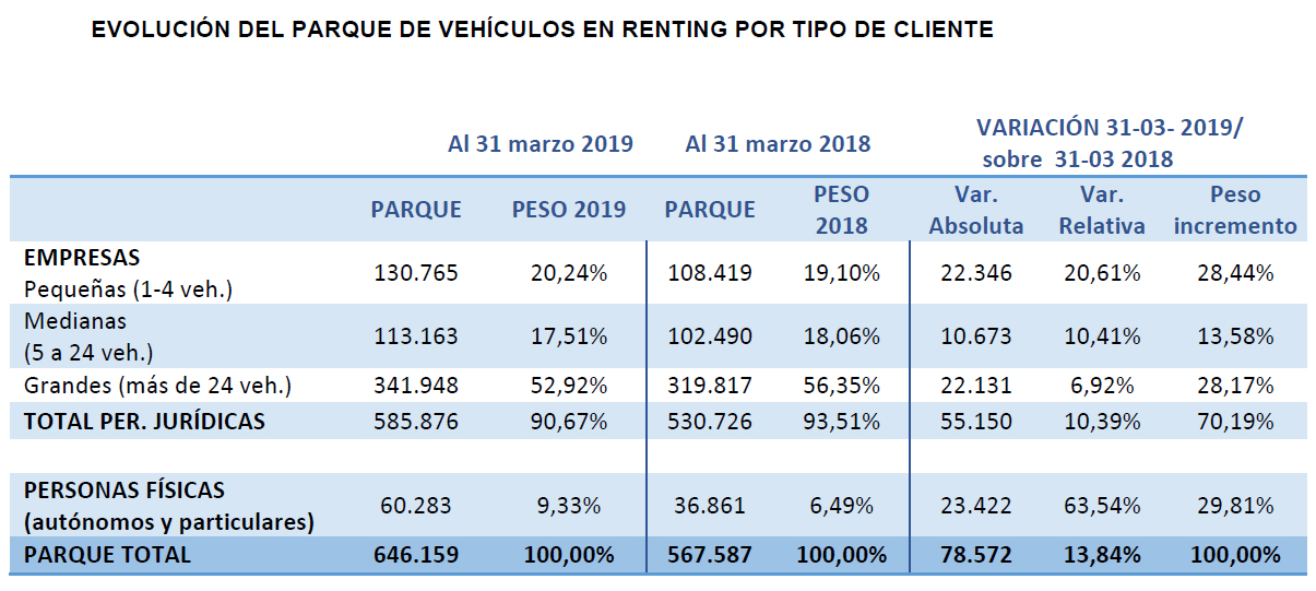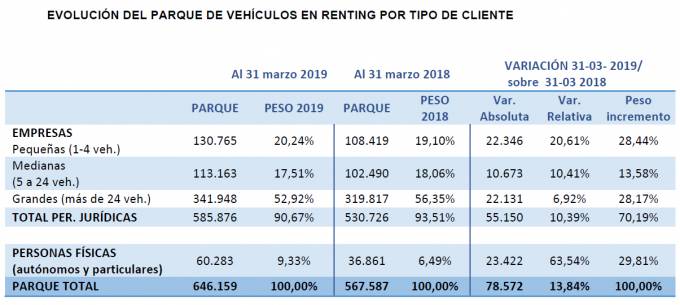 El parque de automóviles en renting creció un 13,84% en el primer trimestre de 2019, ascendiendo a 646.159 vehículos, que se traduce en 78.572 unidades más que hace un año, según datos publicados por la Asociación Española de Renting (AER). Pequeñas empresas, autónomos y particulares copan el 58,25% de este crecimiento y continúan estimulando el sector.