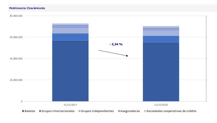 Los bancos son los que dominan este negocio, con una cuota de mercado del 78,25%, tras incrementarla en el año en 21 pb. Estas entidades han registrado las mayores captaciones netas en el año 749 millones, pero el rendimiento negativo de las carteras ha pasado una factura de 2.504 millones, con lo que el descenso del patrimonio ha sido finalmente del 3,09%. Todos los tipos de entidad (bancos, grupos internacionales, grupos independientes, aseguradoras y sociedades cooperativas de crédito) tienen un balance patrimonial negativo en el año, siendo los grupos internacionales los que más han sufrido este retroceso en términos porcentuales, con un 7,33%, seguido de las mencionadas aseguradoras.
