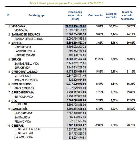 VidaCaixa lidera una vez más el ranking de grupos por provisiones de Vida. Esta vez, sus provisiones superan los 79.020 millones de euros después de crecer un 3,84% a 30 de junio de 2025. Su cuota de mercado se sitúa en el 36,75%.