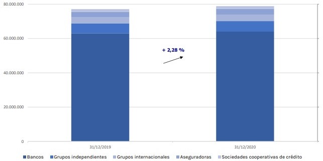 Los bancos mantienen su posición mayoritaria de cuota de mercado (81,18%), por delante de los grupos independientes (7,76%) y los internacionales (4,58%). Caixabank sigue líder por patrimonio gestionado, con 17.993 millones y una cuota de un 22,82%.