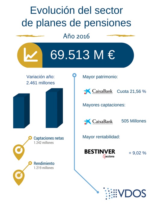 El patrimonio de los Planes de Pensiones del sistema individual ha aumentado en el 2016 un 3,67 % hasta los 2.461 millones que sitúa el patrimonio total gestionado en 69.513 millones, según datos de VDOS.