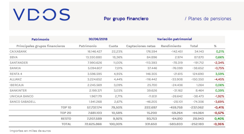 El patrimonio de los Planes de Pensiones del sistema individual ha descendido en el primer semestre un 0,35%, o lo que es lo mismo ha tenido una caída de 252 millones. De esta manera el total gestionado se sitúa en 72,625 millones. Según los datos de VDOS el descenso viene provocado por el rendimiento negativo de las carteras, especialmente en la última semana del semestre que "ha llevado a tener un retroceso por valor de 583 millones". Por el contrario, se han producido captaciones netas de 331 millones.