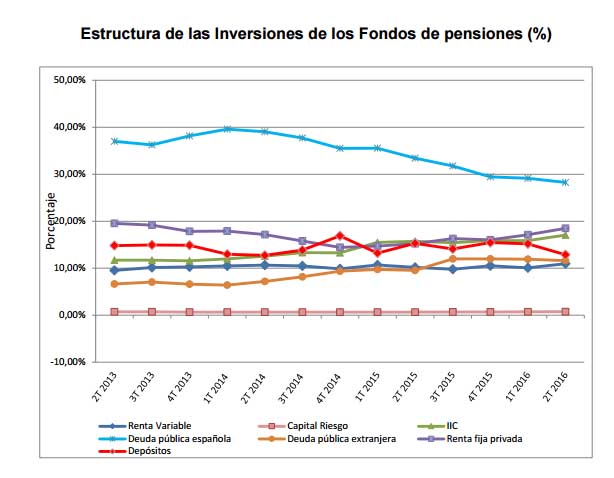 La estructura de las inversiones de los Fondos de Pensiones muestra que la renta fija representa el 58,39% de la cartera. La deuda pública española “sigue siendo la partida de inversiones con mayor peso en las carteras, como se observa a lo largo de todo el periodo de referencia, con un peso por debajo del 30% de la cartera por segundo trimestre consecutivo”. En cambio, el mayor incremento de inversión en este trimestre por parte de los Fondos de Pensiones es en la renta variable.