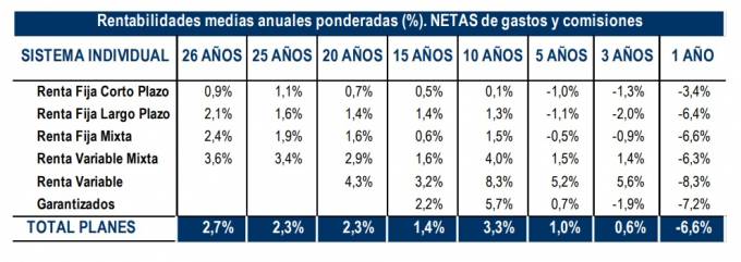 A pesar de que los rendimientos son negativos en el corto plazo con una rentabilidad negativa del 6,6%, la naturaleza de los Planes de Pensiones dirigida hacia el ahorro a largo plazo permite a los Planes de Pensiones aprovechar esta condición, y presentar rentabilidades positivas en el medio-largo plazo. Por ejemplo, a 26 años, los Planes de Pensiones registran una rentabilidad media anual (neta de gastos) del 2,7% y, en el medio plazo (10 y 15 años), presentan una rentabilidad del 3,3% y 1,4% respectivamente