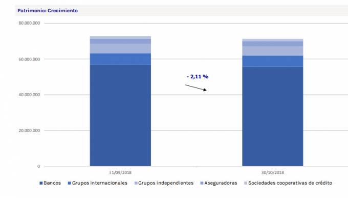 Por tipo de entidad, solo las sociedades cooperativas de crédito han registrado captaciones netas en el mes, con 3 millones. A pesar de estas captaciones, todos los tipos han registrado descensos patrimoniales, siendo los grupos independientes e internacionales los que porcentualmente han registrado mayores caídas, con un 2,72% y un 2,61%, respectivamente; seguidas de las entidades aseguradoras, con un 2,46%.