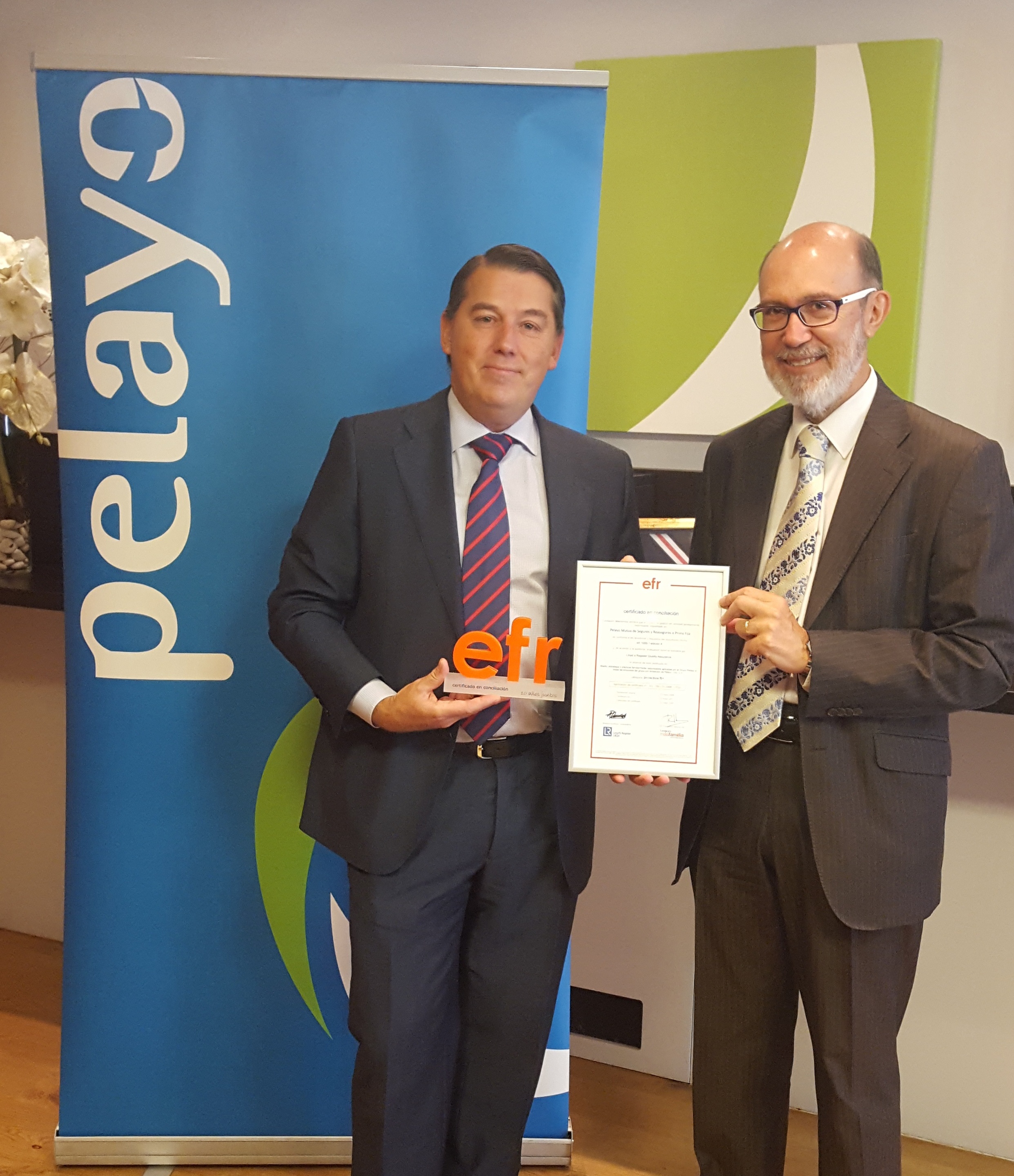 Pelayo ha informado de que tras culminar la 3ª auditoría de renovación del Certificado efr, ha recibido en su sede central de la calle Santa Engracia de Madrid a Rafael Fuertes, director general de la Fundación MásFamilia, quien ha hecho entrega del certificado a José Boada, presidente de Grupo Pelayo.