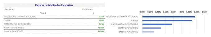 En términos de rentabilidad, PSN ha sido la más destacada en el mes, con un avance de un 1,35%, seguida de Caser, con un 1,28%. Entre las principales gestoras, Bankia Pensiones es la que ha tenido un mejor compartimiento, registrando una rentabilidad de un 0,30%.