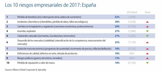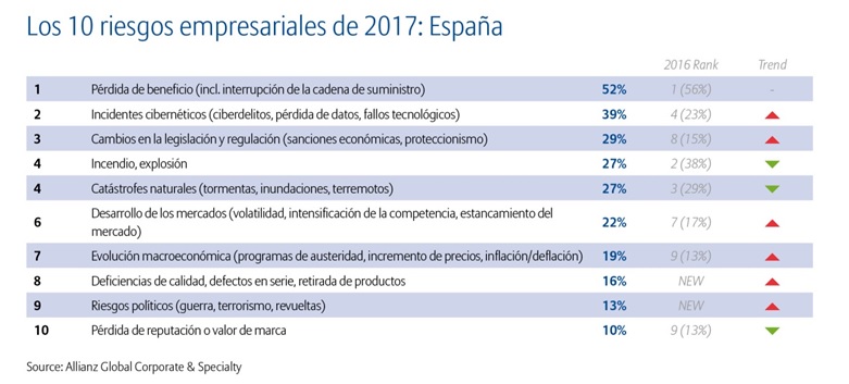 La pérdida de beneficio y los incidentes cibernéticos son los 2 principales riesgos a los que se enfrentan las empresas españolas según el 6º Barómetro de Riesgos de Allianz.