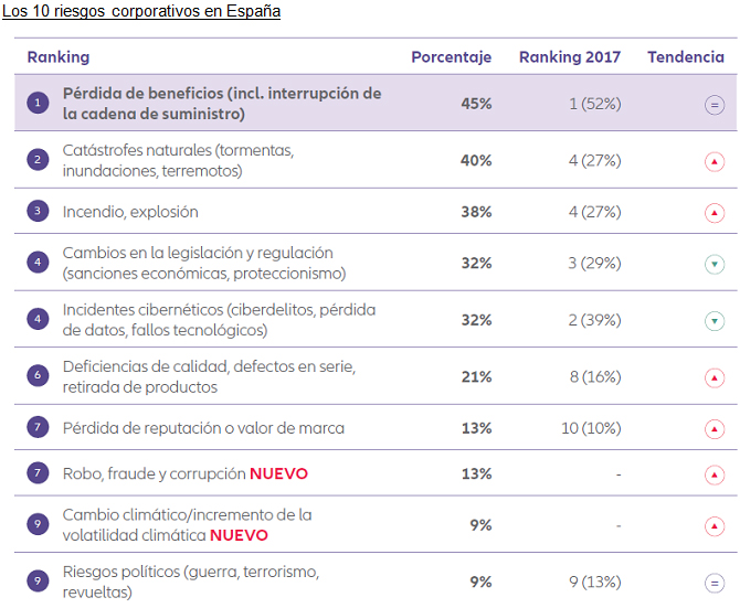 En el resto del mundo, la pérdida de beneficios también es considerada la principal amenaza a la que tendrán que enfrentarse las empresas en 2018. Y lidera esta peculiar clasificación por sexto año consecutivo, figurando en primera posición en 13 países y en las regiones de Europa, Asia-Pacífico, África y Oriente Medio. En el estudio se constata que las empresas afrontan un número creciente de escenarios, que van desde los riesgos tradicionales (incendios, catástrofes naturales e interrupción de la cadena de suministro) hasta nuevos factores detonantes derivados de la digitalización y la interconexión que normalmente no provocan daños materiales pero sí grandes pérdidas económicas. El fallo de sistemas informáticos esenciales, los actos de terrorismo, la violencia política, los incidentes de deficiencia de calidad o los cambios imprevistos en la legislación pueden llevar a las empresas a un cese temporal o prolongado de actividad con efecto devastador sobre sus ingresos.