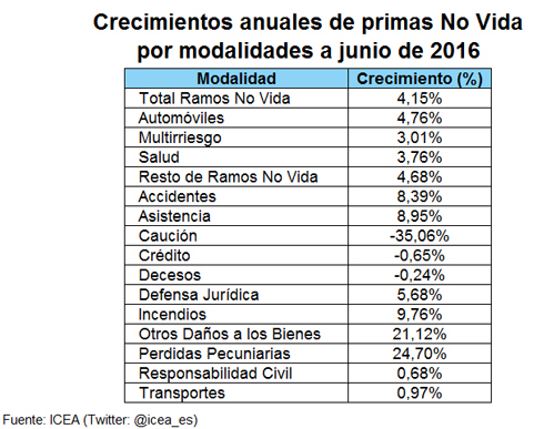 Durante el primer semestre del año las modalidades de seguros No Vida que más crecieron fueron las de Pérdidas Pecuniarias (24,7%), Otros daños a los bienes (21,1%) y ya por detrás Incendios (9,8%), según los datos del estudio de ICEA ‘Evolución del Mercado Asegurador. Estadística a Junio. Año 2016’.