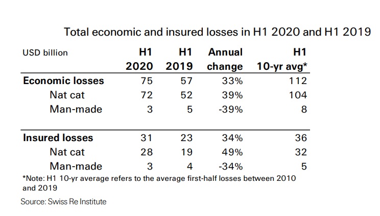 Las perdidas mundiales de propiedades aseguradas provocadas por catástrofes ha crecido un 34% en el primer semestre de 2020 hasta los 31.000 millones de dólares frente a los 23.000 del año anterior, según estimaciones de Swiss Re Institute.