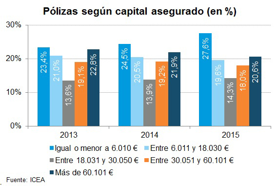 Si se analizan las características de las pólizas de seguros de Vida según el capital asegurado, se observa que casi un 20,6% de las pólizas tienen un capital asegurado de más de 60.101 euros, mientras que en el 47,2% de los casos el capital asegurado no supera los 18.000 euros.
