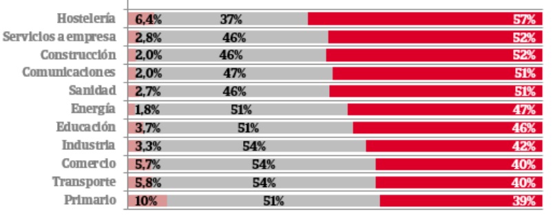 Por sectores, los mayores crecimientos se esperan en hostelería (57%), servicios a empresa (52%), construcción (52%), comunicaciones (51%), sanidad (51%) y energía (47%). En el extremo más pesimista se encuentran las empresas dedicadas al sector primario: apenas un 39% espera una mejoría y el 10% espera un deterioro del entorno de negocio sectorial.