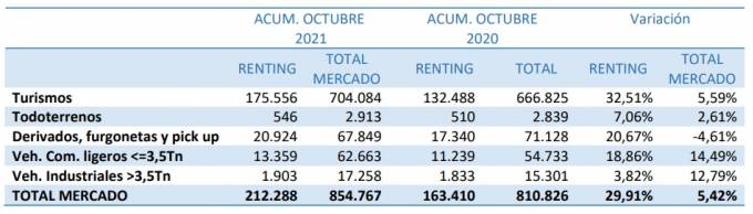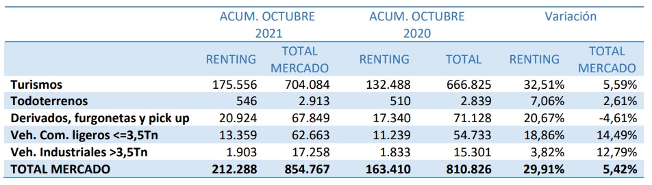 En cuanto a las inversiones en compra de vehículos generadas por el sector del renting alcanzan los 4.585 millones, a octubre de 2021, con un incremento del 36,78% aunque un 7,65% menos que la inversión acumulada a octubre de 2019.