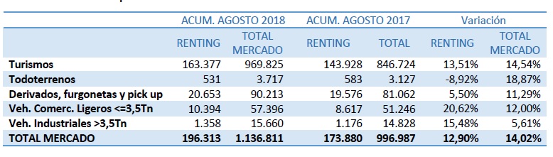 El peso del renting supone ya el 17,27% del total de las matriculaciones de nuestro país. Según los últimos datos de la AER hasta agosto se han matriculado 196.313 unidades, lo que supone un crecimiento del 12,90%, sobre el mismo periodo de 2017.