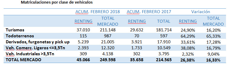 La Asociación Española de Renting de Vehículos (AER) ha publicado los datos de las matriculaciones de vehículos registradas por las compañías de renting acumuladas a febrero. Durante este periodo, se han contabilizado 45.066 unidades en renting, lo que supone un crecimiento del 26,38% sobre el mismo periodo de 2017. Por su parte, el mercado total en España ha matriculado, en el acumulado del año, 249.598 unidades, es decir, ha experimentado un crecimiento del 16,33%. En lo relativo a las cifras registradas en febrero, el renting ha contabilizado 24.946 unidades, un 23,23% más que en febrero de 2017, cuando se matricularon 20.244 unidades.