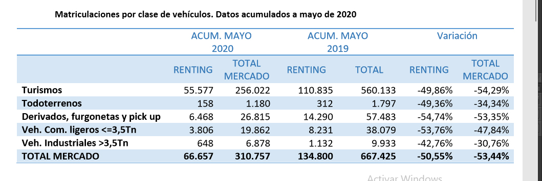 En mayo se han matriculado en el sector de renting 10.491 unidades, frente a las 29.920, que se matricularon en mayo de 2019, es decir, se ha registrado una caída del 64,94%.