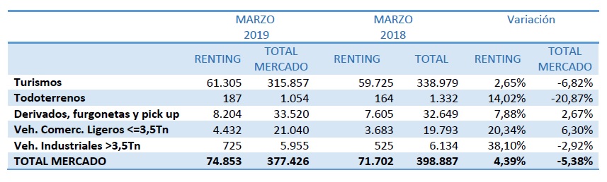 El peso del renting en el total de las matriculaciones del mercado se sitúa en el 19,83% en el primer trimestre del año según datos publicados por la Asociación Española de Renting de Vehículos (AER). Las matriculaciones en renting se elevan a 74.853 unidades, lo que supone un crecimiento del 4,39% sobre el mismo periodo de 2018.
