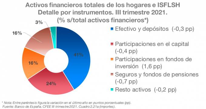 El 41% del grueso de los activos financieros de los hogares se mantuvo en efectivo y depósitos, por delante de las participaciones en el capital (24%), seguros y Fondos de Pensiones (16%) y participaciones en fondos de inversión (16%). De hecho, el componente de participaciones en fondos de inversión fue el único que incrementó su peso frente al año anterior, mientras que el peso de los seguros y fondos de pensiones fue el que más cayó (-0,7%).