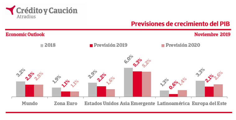 En la eurozona, la economía se está ralentizando más de lo esperado. El crecimiento previsto por la aseguradora de crédito para la zona euro en 2019 y 2020 quedará limitado al 1,1%, ocho décimas por debajo de 2018.