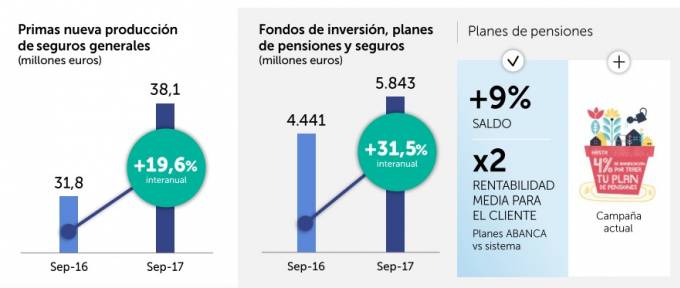 Abanca acaba de presentar los resultados correspondientes al tercer trimestre y destaca el fuerte avance en las ventas de productos fuera de balance sobre todo de los Planes de Pensiones. En lo que va de año, y a la espera de los resultados del último trimestre en el que se realizará un especial esfuerzo comercial según señala la entidad, el crecimiento acumulado de los Planes es del 9,4%, equivalente al doble de la media del sector.