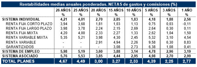 En el largo plazo, los Planes de Pensiones continúan generando rendimientos positivos: a 26 años, la rentabilidad media anual alcanza el 4,7%. Y en el medio: a 10 años, el 2,3%; y a 5 años, el 4,4%.