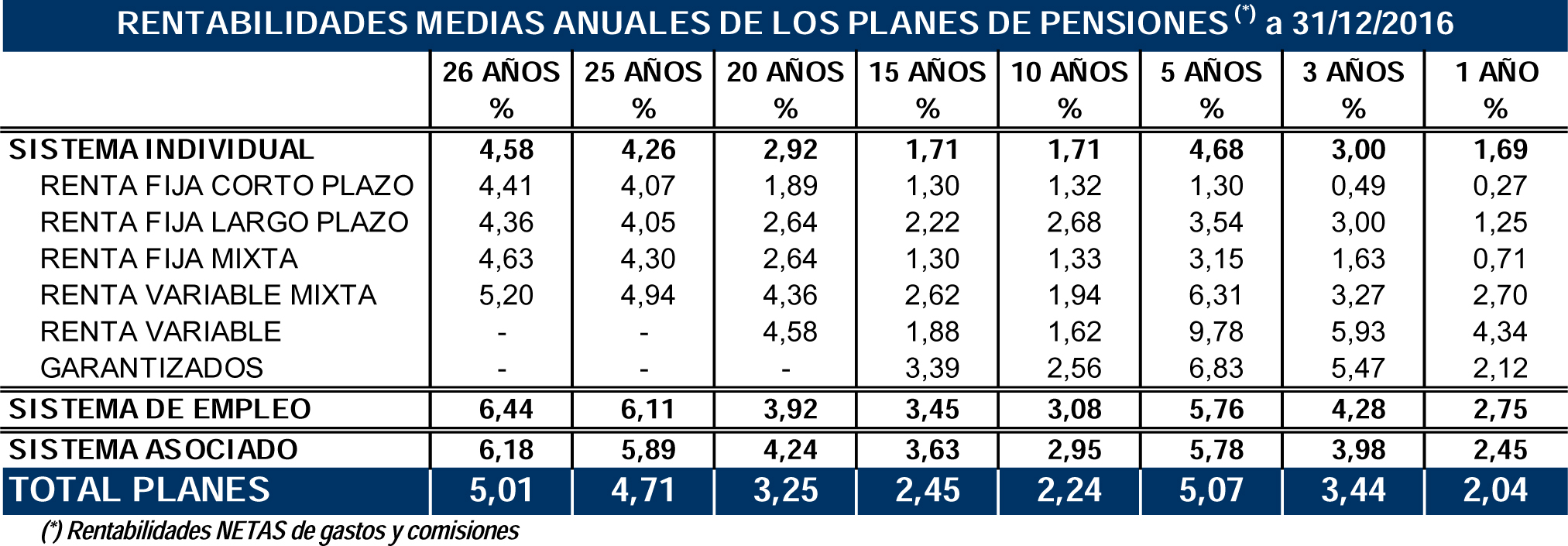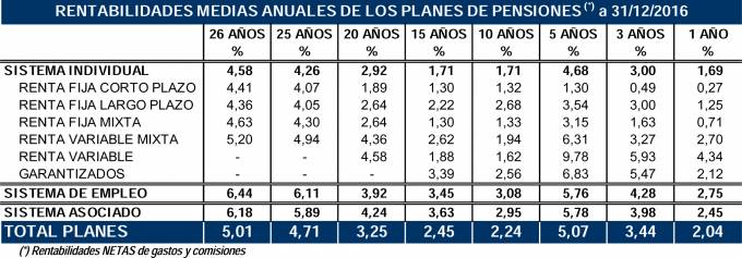 El conjunto de Planes de Pensiones cerró 2016 con una rentabilidad media anual neta de comisiones y gastos del 2,04%, superior a la inflación, según los datos de Inverco. En el largo plazo, los Planes de Pensiones siguen generando rendimientos positivos para sus partícipes: a 26 años, la rentabilidad media anual alcanza el 5% para el total de Planes. En el medio plazo (5 y 10 años) presentan una rentabilidad media anual del 5,1% y 2,2% anual. Respecto al volumen de activos, alcanzó los 106.721 millones de euros, lo que supone un avance del 2,1%.