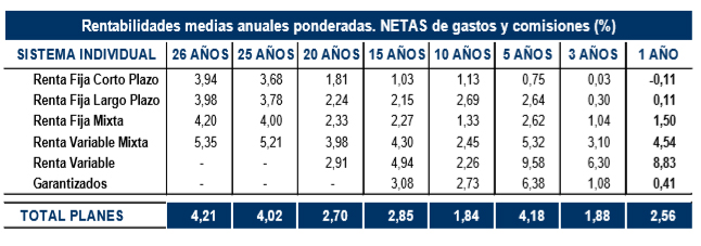 En el largo plazo (más de 25 años) los Planes de Pensiones finalizaron con una rentabilidad media anual del 4,21%. A 5 años los planes obtuvieron un retorno del 4,18%, mientras que los suscritos hace una década consiguieron ingresos extras por valor del 1,9%.