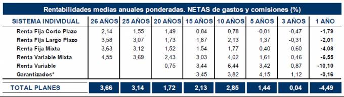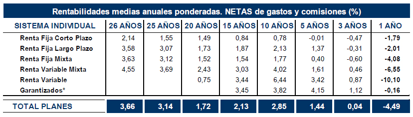 La rentabilidad media a un año para el total de Planes fue del -4,49%. Por categorías los resultados fueron: Renta Fija Corto plazo, -1,79%; Renta Fija Largo Plazo, -2,01%; Renta Fija Mixta, -4,08%; Renta Variable Mixta, -6,55%; Renta Variable, -10,10%; y Garantizados, -0,16%.