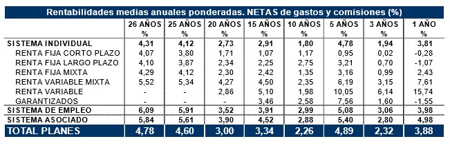 En el largo plazo, los Planes de Pensiones siguen generando rendimientos positivos para sus partícipes. A 26 años, la rentabilidad media anual alcanza el 4,8%. Igual sucede en el medio plazo, con una rentabilidad media anual del 4,9% a 5 años y del 2,3% a 10 años.