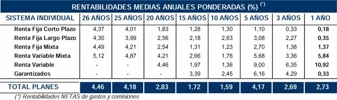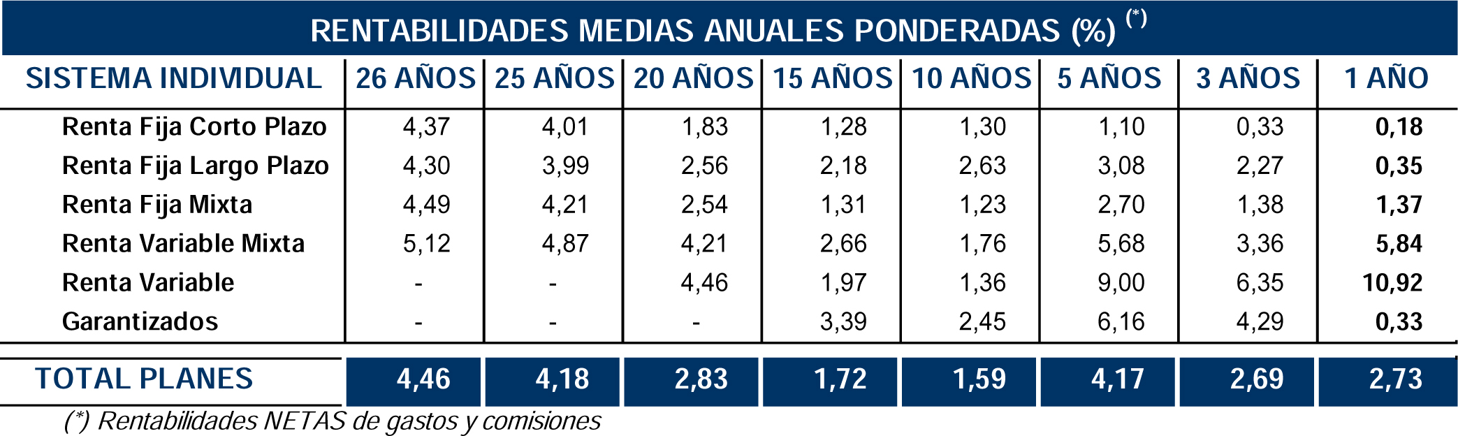 En el largo plazo los Planes de Pensiones alcanzan una rentabilidad media anual superior al 4,4%. En el medio plazo (5 y 10 años) los Planes de Pensiones presentan una rentabilidad media anual del 4,2% y 1,6% respectivamente.