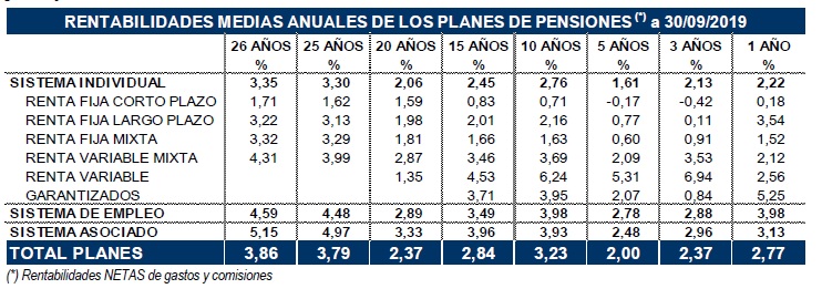 El tercer trimestre del año ha permitido a los Planes de Pensiones consolidar los rendimientos realizados en trimestres anteriores. De media, los Planes de Pensiones presentan una rentabilidad interanual del 2,77%, con rentabilidades positivas en todas las categorías, destacando aquellas con mayor exposición a renta fija de larga duración, tras la intensa revalorización que ha experimentado la deuda pública a 10 años, cuya TIR ha descendido hasta el 0,13% desde el 1,4% del año anterior.