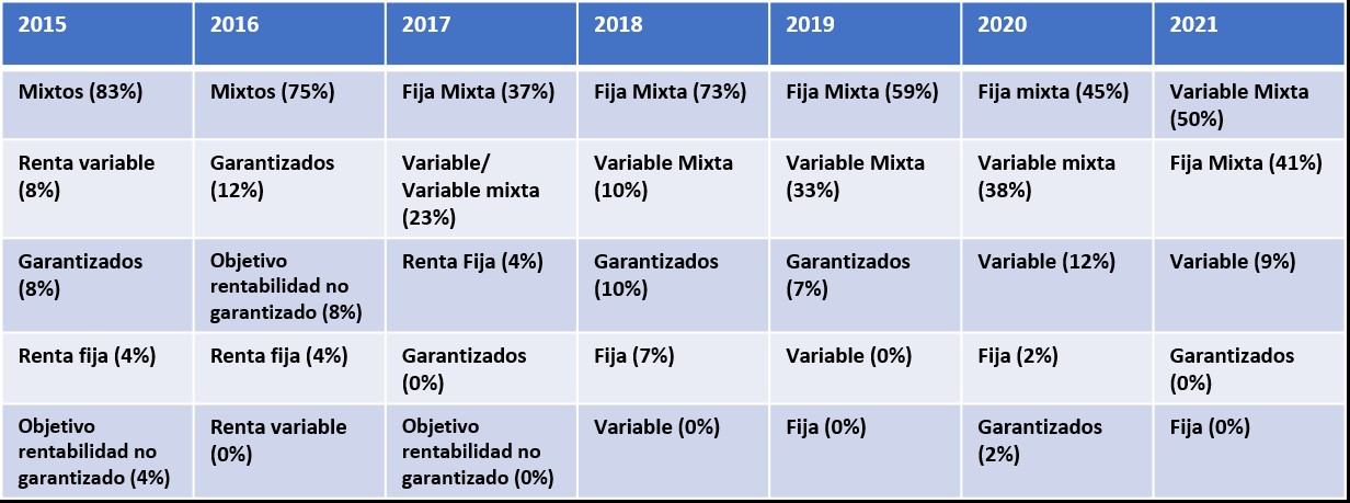 La mitad de las gestoras de Planes de Pensiones que operan en España confirman que los productos de renta variable mixta son los más demandados en este final de 2021, desbancando así a los productos de renta fija mixta (41%), según refleja la XII Encuesta sobre Planes de Pensiones Individuales elaborada por el Observatorio Inverco.