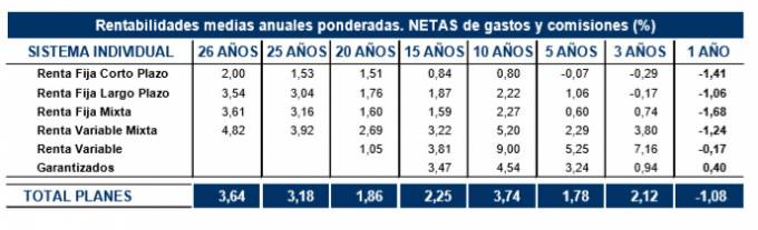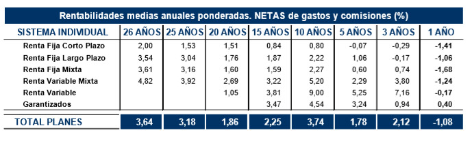 En el largo plazo los Planes de Pensiones del Sistema Individual registran una rentabilidad media anual del 3,64% y, en el medio plazo, asciende al 1,78% para los planes de 5 años y del 3,74% para los de 10 años.