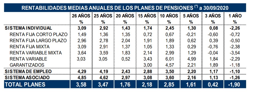 Los Planes de Pensiones continúan compensando la corrección del mercado de marzo por efecto de la crisis sanitaria y vuelven a presentar rentabilidades positivas a todos los plazos superiores al año. La rentabilidad a largo plazo continúa siendo muy satisfactoria: a 25 años, la rentabilidad media anual alcanza casi el 3,5% para el total de Planes, en el medio plazo (10 y 15 años), presentan una rentabilidad del 2,85% y 2,18% respectivamente según los datos facilitados por Inverco.