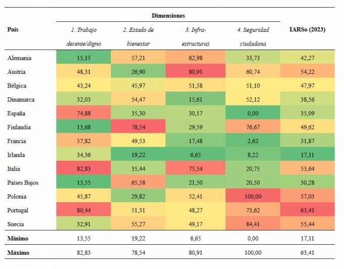 El índice se construye a partir de cuatro grandes dimensiones: trabajo decente y digno, estado de bienestar, infraestructuras y seguridad ciudadana, utilizando más de 30 variables objetivas procedentes de fuentes públicas como Eurostat, la OMS, el Banco Mundial o la Unesco, con datos correspondientes al periodo 2013-2023.