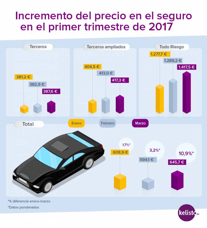 En el primer trimestre de 2017, el precio medio del seguro de coche alcanzó los 616,2 euros, un 2% menos que en el mismo periodo de 2016, cuando costaba de media 629,6 euros. Sin embargo, en lo que va de año la tendencia ha cambiado y, según Kelisto el precio medio ha crecido un 6% desde los 608,87 euros de enero a los 645,6 del mes de marzo.